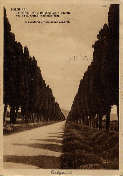 Bolgheri e i cipressi di S. Guido Cartolina illustrata. Carducci visse nella Maremma pisana dal 1838 al 1849. «Ma le mie ricordanze, tristi e pur care, ma tutto il mio ideale di fanciullo, ma tutto il mio amore è per la maremma» (Carducci ad Angelo De Gubernatis, 14 gennaio 1877). | | | | |