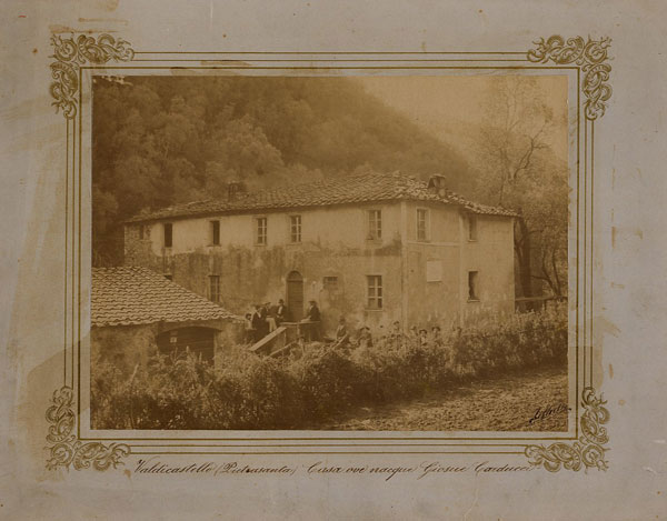 La casa natale di Giosue Carducci a Valdicastello, [1887-1890?] L. Mutti, fotografia albumina. «Nel breve tempo in cui mio padre fu medico-chirurgo di una società francese che aveva preso sopra di sé i lavori delle miniere di piombo argentifero in Valdicastello di Versilia, io nacqui in questo borghetto poco lontano da Pietrasanta addì 27 di Luglio 1835 (l’anno che il colera invase l’Italia), giorno di martedì, alle ore 11 della sera; primo figlio del dott. Michele Carducci pietrasantino e della Ildegonda Celli cittadina fiorentina» (Ricordi di Versilia). | |