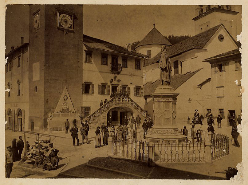 Pieve di Cadore: Piazza Tiziano [dopo il 1875] Fotografia albumina. Preso alloggio, il 31 luglio 1892, all’Albergo Progresso, nella piazza, lo scrittore poteva contemplare la statua di Tiziano e il monumento che ricordava l’impresa eroica di Pietro Fortunato Calvi, «divino giovane» evocato nell’ode Cadore (Rime e ritmi, Bologna, Zanichelli 1899). «Io son qui dal 31 luglio e mi andrò fino a settembre aggirando per questa regione, che è veramente bellissima e piena di ricordi e di gente onesta e valorosa» (all’amico Giuseppe Chiarini, 12 agosto).