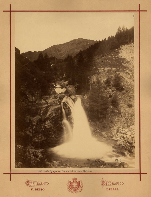 La cascata del Madesimo in Valle Spluga V. Besso, fotografia albumina. Carducci trascorse le sue estati a Madesimo nella vallata solcata dal fiume Madesimo, vicino al confine con la Svizzera, lungo un arco di quindici anni (1888-1905), nei mesi di luglio e agosto, se si escludono i periodi in cui villeggiò fra Courmayeur e Gressoney, e in Cadore. La stazione climatica famosa per le cure idroterapiche, suggeritagli da Augusto Murri, dopo il piccolo ictus del 1885, divenne ben presto luogo dell’anima.