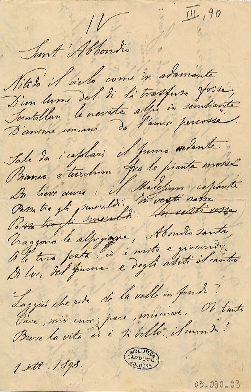 G. Carducci, Sant’Abbondio Redazione autografa dell’idillio alpino iniziato a Madesimo il 31 agosto 1898, festa del patrono del paese. Farà parte dell’ultima silloge di versi, Rime e ritmi. | | | | |