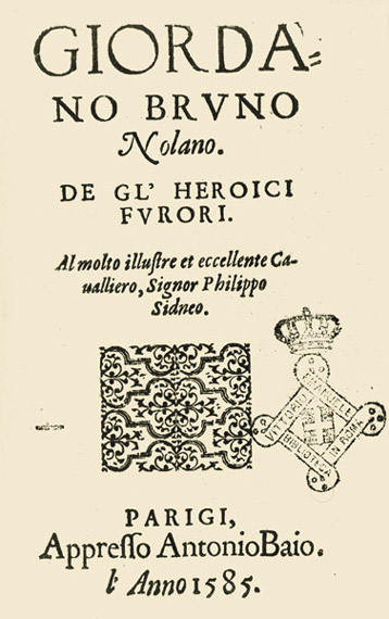 G. Bruno, La cena delle Ceneri (Londra, 1584) | Ritratto di Elisabetta I, regina di Inghilterra (incisione, sec. XVII) | G. Bruno, De gl’heroici furori (Londra, 1585) |