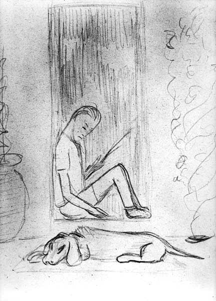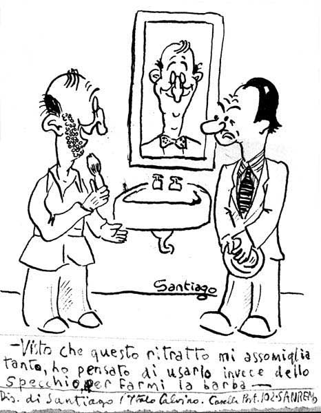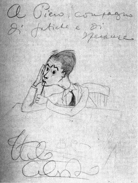 Autoritratto a scuola, con dedica. Le prime prove creative di Calvino sono disegni, di tratto asciutto, inclini all’umorismo, alla caricatura.