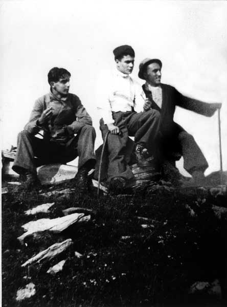 Calvino con due amici in gita sulle montagne liguri nel 1939. “Eravamo i ‘duri’ di provincia, cacciatori, giocatori di biliardo, gradassi, fieri della nostra rozzezza intellettuale, schernitori d’ogni retorica patriottica o militare, grevi nel parlare, frequentatori di bordelli, sprezzanti ogni sentimento amoroso e disperatamente senza donne”