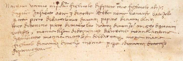 Il nucleo più cospicuo degli atti d'archivio esposti appartiene all'Archivio di Stato di Firenze: trentacinque documenti, dalla fondamentale annotazione relativa alla nascita di Leonardo, scoperta da Moller negli anni Trenta; l'atto fu rogato a Firenze il 4 luglio 1520 e, finora sconosciuto, è emerso dal lavoro di ricerca effettuato per la mostra.