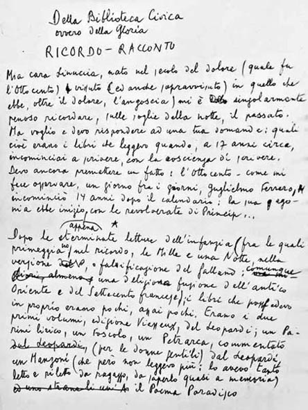| | LA MIA INFANZIA FU POVERA E BEATA DI POCHI AMICI, DI QUALCHE ANIMALE; CON UNA ZIA BENEFICA ED AMATA COME LA MADRE, E IN CIELO IDDIO IMMORTALE. ALL’ANGELO CUSTODE ERA LASCIATA SGOMBRA, LA NOTTE, METÀ DEL GUANCIALE; MA PIÙ CARA LA SUA FORMA HO SOGNATA DOLO LA PRIMA DOLCEZZA CARNALE. DI RISA IRREFRENABILI I COMPAGNI, E A ME DI STRANO FERVORE ARGOMENTO, QUANDO ALLA SCUOLA I VERSI RECITAVO; TRA FISCHI, CORI, ANIMALESCHI LAGNI, ANCOR MI VEDO IN QUELLA BOLGIA, E SENTO SOLO UN’INTIMA VOCE DIRMI BRAVO.