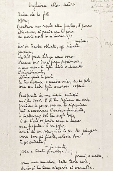 | | PREGHIERA ALLA MADRE MADRE CHE HO FATTO SOFFRIRE (CANTAVA UN MERLO ALLA FINESTRA, IL GIORNO ABBASSAVA, SÌ ACUTA ERA LA PENA CHE MORTE A ENTRAMBI IO M’INVOCAVO) MADRE IERI IN TOMBA OBLIATA, OGGI RINATA PRESENZA, CHE DAL FONDO DILAGA QUASI VENA D’ACQUA, CUI DURA FORZA REPRIMEVA, E UNA MANONLE TOGLIE ABILE O INCAUTA L’IMPEDIMENTO; PRESAGA GIOIA IO SENTO IL TUO RITORNO, MADRE MIA CHE HO FATTO, COME UN BUON FIGLIO AMOROSO, SOFFRIRE.