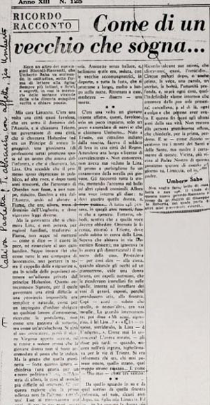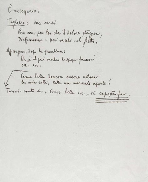 Correzioni autografe al sonetto n.2 di Autobiografia (1924) | | CITTÁ VECCHIA SPESSO PER RITORNARE ALLA MIA CASA PRENDO UN’OSCURA VIA DI CITTÀ VECCHIA. GIALLO IN QUALCHE POZZANGHERA SI SPECCHIA QUALCHE FANALE, E AFFOLLATA È LA STRADA. QUI TRA LA GENTE CHE VIENE CHE VA DALL’OSTERIA ALLA CASA O AL LUPANARE, DOVE SON MERCI E UOMINI IL DETRITO DI UN GRAN PORTO DI MARE, IO RITROVO, PASSANDO, L’INFINITO NELL’UMILTÀ. QUI PROSTITUTA E MARINAIO, IL VECCHIO CHE BESTEMMIA, LA FEMMINA CHE BEGA, IL DRAGONE CHE SIEDE ALLA BOTTEGA DEL FRIGGITORE, LA TUMULTUANTE GIOVANE IMPAZZITA D’AMORE, SON TUTTE CREATURE DELLA VITA E DEL DOLORE; S’AGITA IN ESSE, COME IN ME, IL SIGNORE. QUI DEGLI UMILI SENTO IN COMPAGNIA IL MIO PENSIERO FARSI PIÙ PURO DOVE PIÙ TURPE È LA VITA. Trieste e una donna (1910-1912) |