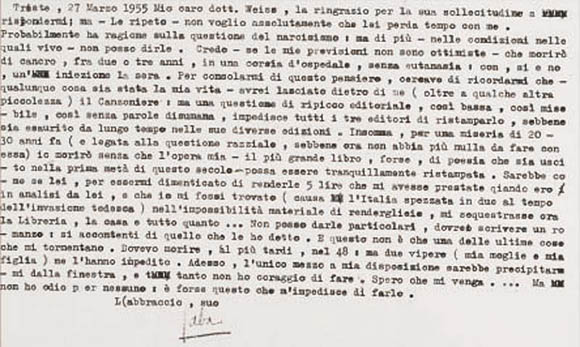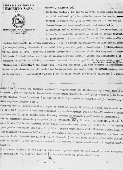 Il carteggio che Saba intrattiene con Weiss, con il suo allievo Joachim Flescher e poi con Giovanni Bollea è di grande interesse per comprendere l’aspro cammino che trasforma in un potente farmaco la sua poesia.