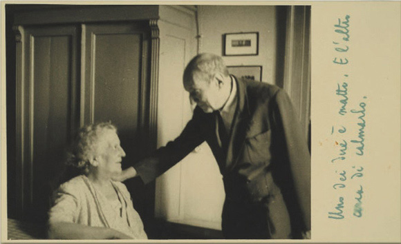 Pare che a Trieste per dire «un uomo» si dica «un mato»: foto di Saba con la moglie Lina e una dedica umoristica sulla pazzia.