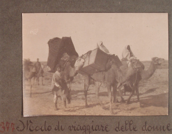 La fotografia, prima di due, mostra un gruppo di donne arabe riprese durante un viaggio su cammelli.